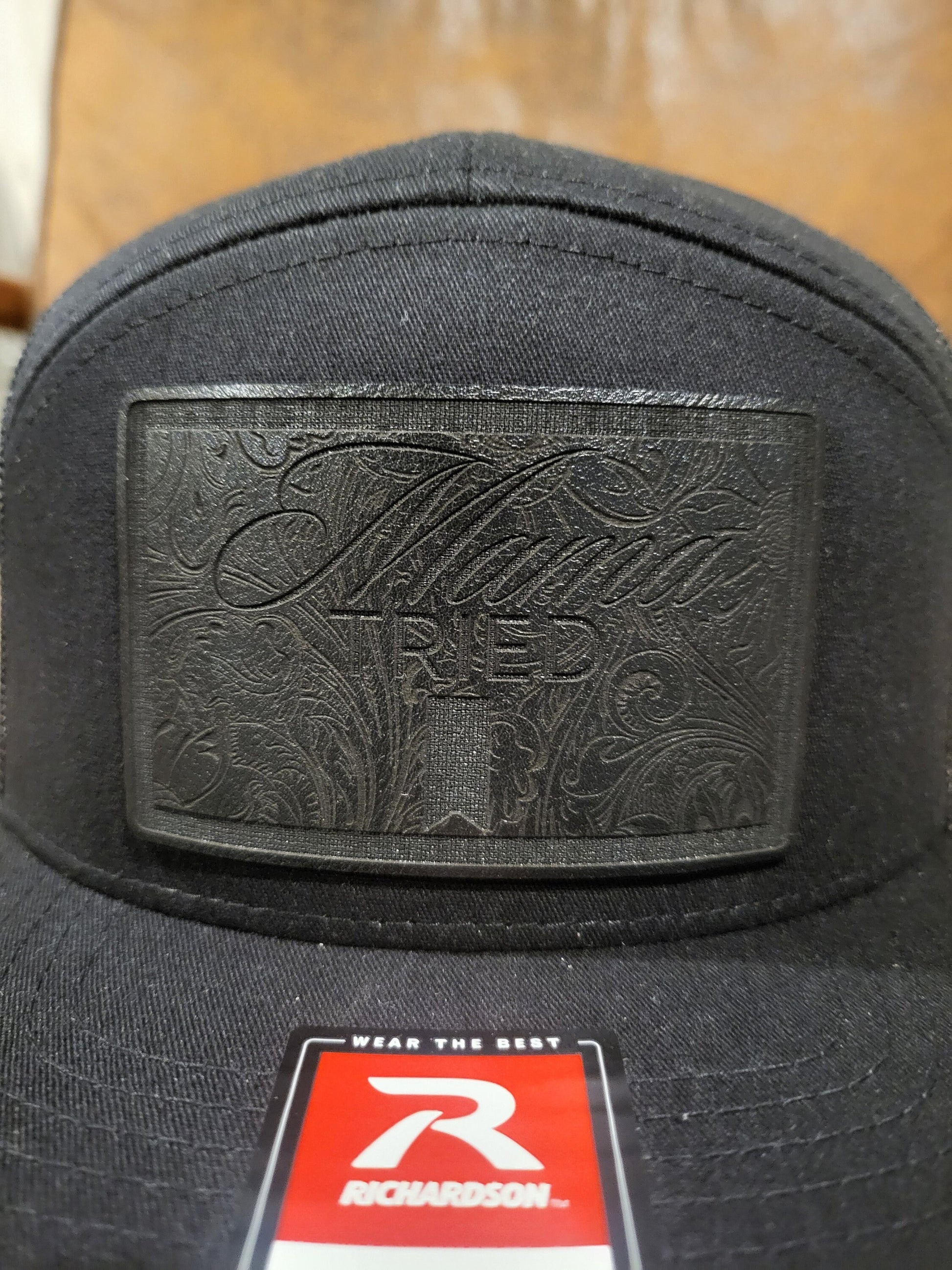 Title: Momma Tried Mama Tried all black leather Hat on black Richardson 112 Round Bill or Richardson 168 Flatbill Ball Cap
